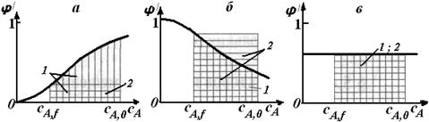 Выход целевого продукта ФR, определенный по уравнениям (5.16) для реактора идеального вытеснения и (5.17) для реактора идеального смешения, можно представить графически в виде площадей криволинейной трапеции (ФR,B) и прямоугольника (ФR,С). Соотношение между этими площадями зависит от характера функции φ'(cА).