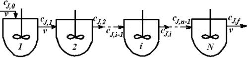 Допущения об отсутствии обратного влияния в каскаде реакторов идеального смешения существенно упрощают расчет. Он сводится к последовательному решению уравнений материального баланса для каждой секции относительно концентрации реагента (или продукта) на выходе. Выходной параметр для первой секции (концентрация сJ,i), полученный из первого уравнения, является входным параметром для второй секции, выходной параметр второй секции – входным для третьей и т. д.