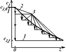 Рис. 5.11. Изменение концентрации реагента при прохождении реакционной смеси через последовательные секции единичного реактора идеального смешения (1), реактора идеального вытеснения (2) и каскада реакторов идеального смешения (3)