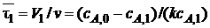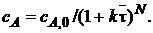 Различают аналитический метод и численные методы расчета каскада. Применение аналитического метода возможно в том случае, если уравнения материального баланса могут быть аналитически решены относительно концентрации сJ. Это можно сделать, например, если протекающие реакции описываются кинетическими уравнениями первого или второго порядка. Рассмотрим определение концентрации реагента А на выходе из каскада реакторов, включающего в себя N секций равного объема (V1 = V2 = ... = Vi...= VN) при проведении реакции первого порядка, скорость которой описывается уравнением wrA = kсА. Из уравнения материального баланса для первой секции