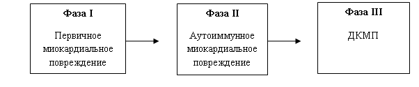 Jay W. Mason и соавт., предложили выделять в развитии ДКМП три фазы. Деление на фазы не является догмой, в каждую из трех фаз может преобладать тот или иной патогенетический механизм развития заболевания [41].