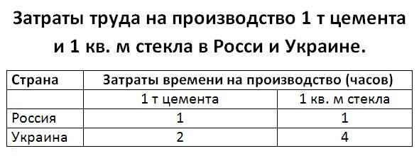 Примечание. Российские и украинские предприятия используют одни и теже технологии изготовления стекла и цемента и потому затраты сырья и энергии на предприятиях обеих стран одинаковы. Различия связаны только с с затратами труда (рабочего времени) на производство единицы продукции.