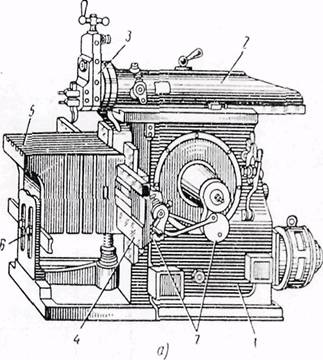 На рисунке 2 а) показан общий вид поперечно – строгального станка. В верхних направляющих станины 1 смонтирован ползун 2, совершающий с помощью кулисного механизма возвратно – поступательное перемещение (главное движение). На левом конце ползуна укреплен суппорт 3. Он состоит из поворотного диска 1 показанных на рисунке 2 б) и салазок 2, получающих периодически вертикальную подачу от ходового винта 3. На салазках смонтирована резцовая каретка 4 с откидной планкой 5 и резцедержателем 6.