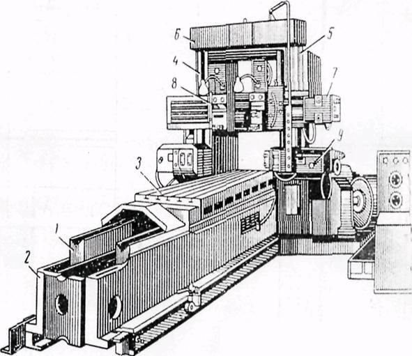 В двухстоечном продольно – строгальном станке в соответствии с рисунком 3, стол 3 с помощью реечной передачи перемещается по призматическим направляющим 1 станины 2. На рабочей плоскости стола устанавливают и закрепляют заготовки. По обе стороны станины расположены боковые стойки 4 и 5, скрепленные для жесткости поперечной балкой 6. В вертикальных направляющих стоек смонтирована траверса 7, несущая два резцовых суппорта 8 с резцедержателями. С правой стороны станка размещены агрегаты привода. В зависимости от вертикальных размеров заготовок траверсу устанавливают на определенной высоте и зажимают. При строгании стол совершает возвратно – поступательное движение. В конце рабочего хода осуществляется периодическая подача верхних суппортов 8 в горизонтальном, а боковых суппортов 9 — в вертикальном направлении. В связи с этим резцы, установленные в резцедержателях суппортов 8, обрабатывают горизонтальные плоскости или линейчатые поверхности, а в суппортах 9 — боковые.