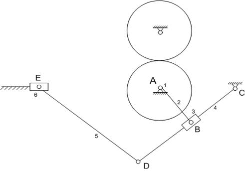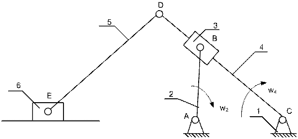 1 – станина, 2 – кривошип AB, 3 - ползун В, 4 – коромысло СD, 5 – коромысло DE, 6 – ползун E.