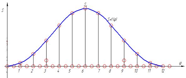Диаграмма перемещений выходного звена строится следующим образом: по оси абсцисс откладываем обобщенную координату, то есть угол перемещения входного звена, таким образом, через 300 получаем 12 точек. По оси ординат откладываем перемещение выходного звена в масштабе кривошипа в зависимости от угла поворота входного звена. При угле