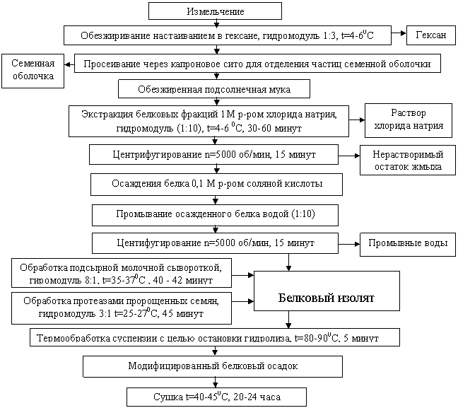 Классическая схема получения белкового изолята из подсолнечного жмыха заключается в экстракции белка диспергирующим агентом с последующим осаждением его в изоэлектрической точке соляной кислотой. Усовершенствованная схема получения белковых изолятов по предлагаемой технологии (рисунок 5) дополнительно включает последовательную обработку сывороточными и растительными протеазами с последующей термообработкой для остановки гидролиза и сушкой модифицированного белкового изолята.