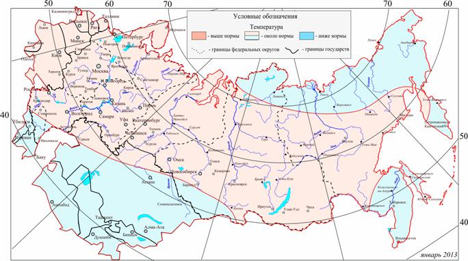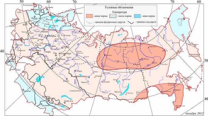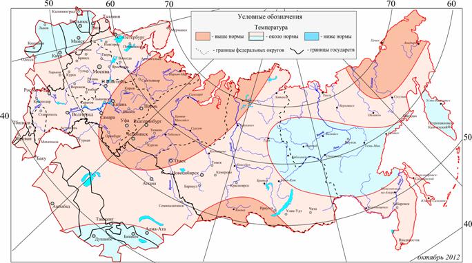 Анализ климатических данных и прогностических разработок НИУ РОСГИДРОМЕТА, выполненный в Гидрометцентре России, позволяет с вероятностью 68-70% сделать вывод о том, что в целом за 6 месяцев холодного полугодия г. г. на большей части территории России температурный фон ожидается близким к средним многолетним значениям.