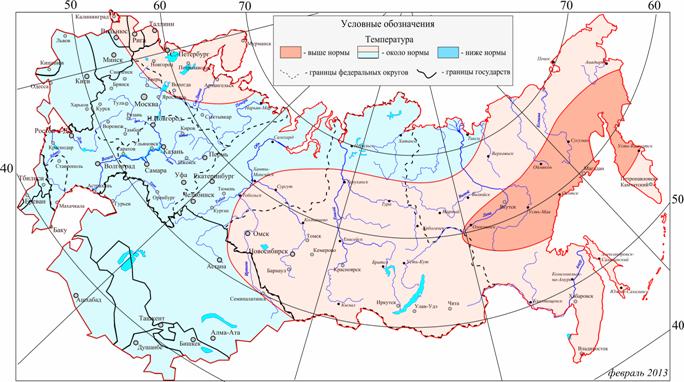 Февраль предполагается теплее, чем в 2012 году, на большей части европейской территории России (70-75%), а также на Чукотке. Холоднее, чем в прошлом году ожидается на севере Уральского и Сибирского федеральных округов (70-73%).