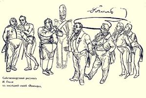 Осенью 1835г. он принимается за написание "Ревизора", сюжет которого подсказан был Пушкиным; работа продвигалась столь успешно, что 18 января 1836г. он читает комедию на вечере у Жуковского (в присутствии Пушкина, и других), а в феврале-марте уже занят ее постановкой на сцене Александрийского театра. Премьера пьесы состоялась 19 апреля. 25 мая — премьера в Москве, в Малом театре.