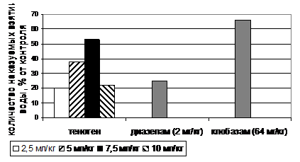 Рисунок 1. Влияние тенотена на количество наказуемых взятий воды в конфликтной ситуации при введении в течение 5 дней в дозах 2,5, 5, 7,5 и 10 мл/кг в сравнении с диазепамом и клобазамом. Данные представлены в виде увеличения числа взятий воды от значения показателя в контрольной группе (в %), M±m. * - отличия от контрольной группы достоверны при p<0,05