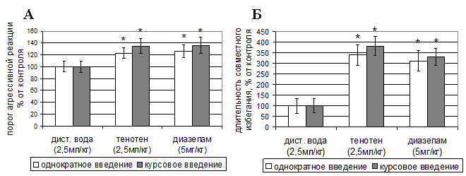 Рисунок 2. Антиагрессивное действие тенотена в сравнении с диазепамом в тестах немотивированной (А) и мотивированной (Б) агрессии, M±m. * - отличия от контрольной группы достоверны при p<0,05