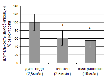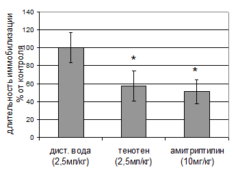 Тревожные расстройства имеют высокую коморбидность с депрессией, эти заболевания обладают перекрывающимися патогенетическими механизмами, ряд препаратов (например, ингибиторы обратного захвата серотонина и норадреналина) применяются для лечения тревожных и депрессивных расстройств [Adell, A., 2010; Brown, C. et al., 2005; Kuzel, R.J., 2005]. Наряду с анксиолитической активностью были выявлены антидепрессантные свойства тенотена в стандартных тестах оценки антидепрессантного действия.