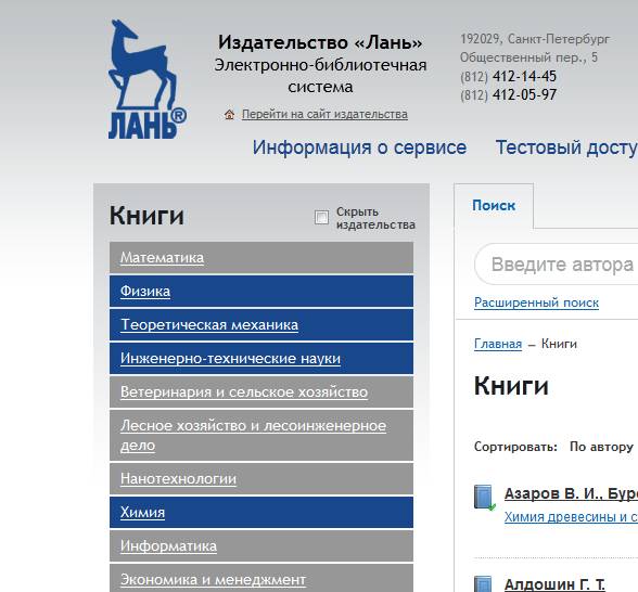 ЭБС «Лань» предлагает большой спектр научных направлений. Университетом куплены только 3 из них и четвертый («Химия») предоставлен нам в качестве бесплатного бонуса. В разделе «Книги» - все эти разделы выделены темно-синим цветом (рисунок №2)