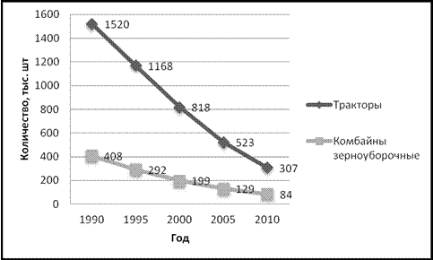 Вместе с тем, необходимо отметить, что в настоящее время сельскохозяйственное машиностроение России находится в глубочайшем кризисе. По сравнению с 1992 г. производство зерноуборочных комбайнов сократилось в 10 раз, а тракторов - в 20 раз. Следствием спада производства становится ежегодное сокращение парка основных видов сельскохозяйственной техники, о чемсвидетельствуют приведенные на рис. 1 графики.