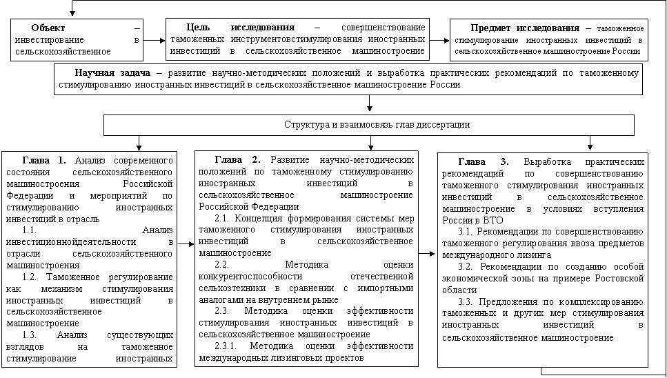 Решение указанных проблемных вопросов предполагает наличие соответствующего научно-методического аппарата. Вместе с тем существующий научно-методический аппарат таможенного стимулирования иностранных инвестиций не позволяет осуществлять достаточно адекватную оценку качества инвестиций и не обеспечивает комплексность подхода к формированию обоснованных решений по стимулированию иностранных инвестиций. Это предопределило суть общей научной задачи диссертационного исследования, которая заключается в развитии научно-методических положений и выработке практических рекомендаций по таможенному стимулированию иностранных инвестиций в сельскохозяйственное машиностроение Российской Федерации.