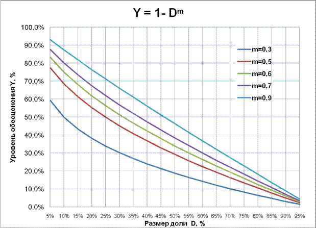 Формула предполагает, что существует экспоненциальное соотношение между стоимостью доли и её размером как ценообразующим фактором. Чаще всего в практике встречается достаточно узкий диапазон значений коэффициентов Чилтона, равный 0,6-0,8. В основном используется среднее значение коэффициента Чилтона[2] на уровне 0,7. Если D=1, то величина обесценения Y=0. Расчетные значения уровня внешнего износа (обесценения) долевой собственности в зависимости от размера доли для различных m<1 приведены на рис.1.