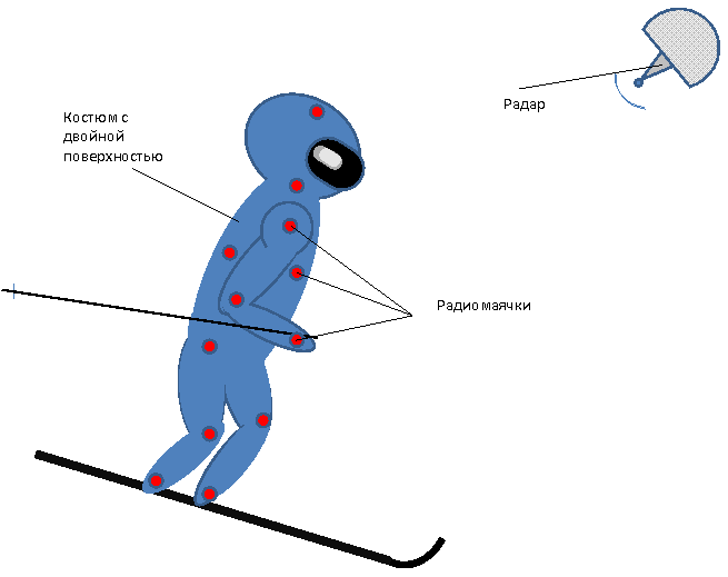 В горнолыжном спорте целесообразно использовать костюм с двойной поверхностью. В процессе спуска спортсмена радары, установленные вдоль трассы, следят за положением тела спортсмена, по установленным в его костюме радиомаячкам. При падении спортсмена радиомаячки окажутся в особом положении, которое станет сигналом для аппаратуры, что ситуация критическая. При этом радары посылают сигнал костюму, в котором между слоями находятся баллончики со сжатым газом. Высвобождаясь, газ заполняет пустоты между слоями костюма и надувает подушку безопасности для спортсмена. После того, как удар от падения был смягчен, в костюме открывается клапан, который частичноно стравливает воздух, повышая силу трения и замедляя скорость движения спортсмена. Как вариант, для торможения можно использовать небольшой парашют или систему из парашютов (рис. 1).