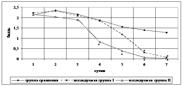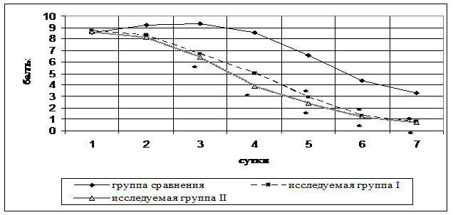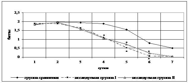 При динамической оценке степени гепатопатии при помощи шкалы SOFA, при сопоставлении с группой сравнения, в исследуемой группе I выявлен более быстрый регресс количества баллов, начиная с 4-х суток интенсивной терапии со статистически достоверной разницей на 6-е (1,39±0,83 и 0,31±0,47) и 7-е (1,27±0,53 и 0,07±0,26) сутки соответственно, а в исследуемой группе II со 2-х суток интенсивной терапии со статистически достоверной разницей на 4-е (1,88±0,66 и 0,82±0,58), 5-е (1,55±0,74 и 0,38±0,49), 6-е (1,39±0,83 и 0,06±0,24) и 7-е (1,27±0,53 и 0,03±0,18) сутки соответственно (рис. 2).