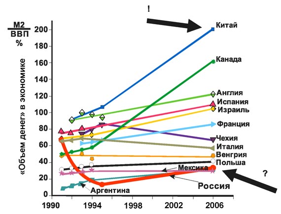 Существуют также значительные масштабы изъятия денег из экономики через механизм Стабилизационного фонда. В результате денег явно не хватает для финансирования производства на уровне его реальных возможностей, а также для создания достаточного массового платежеспособного спроса на внутреннем рынке.