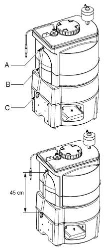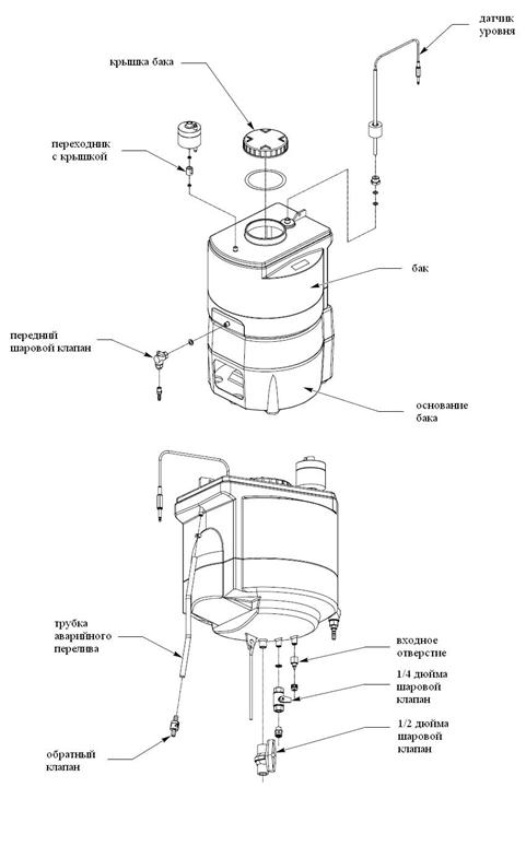 Трубка аварийного перелива подсоединена между баком и обратным клапаном (С). Обратный клапан предотвращает попадание воздуха в бак через трубку аварийного перелива.