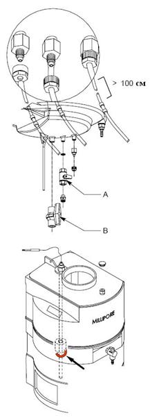 Подсоединить трубку аварийного перелива к баку. Конец трубки аварийного перелива (В) насаживается на стержень на задней стенке бака (А).