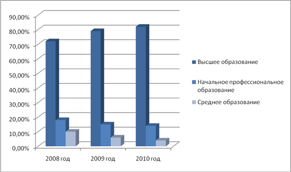 Сравнительный анализ образовательного уровня сотрудников в МУ «ДМО «Шанс»» по сравнению с 2008 годом доля лиц с высшим профессиональным образованием увеличилась с 72% до 82%, так как высшее образование имеет в основном административно - управляющий персонал. Число работников, имеющих начальное профессиональное образование и среднее образование, уменьшилось. Что весьма закономерно, так как уровень выполняемой работы предъявляет свои требования к качеству образования сотрудников.