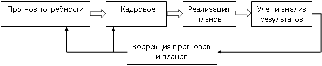 В общем виде процесс управления персоналом, как и во всех сферах управленческой деятельности можно представить в виде так называемой «петли управления», включающей циклическую последовательность следующих этапов: прогноз – планирование - контролируемая деятельность по реализации планов – учет и анализ результатов - коррекция прогнозов и планов (Рис. 2).