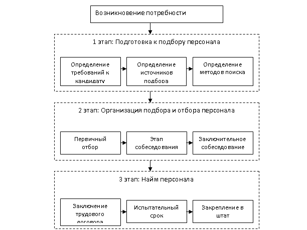 Таким образом, система подбора персонала состоит из элементов (подбора, отбора и найма, основанных на политике регулирования численности персонала), а процесс подбора – из последовательных этапов подбора. Схематично процесс подбора можно представить, как представлено на Рис. 3.