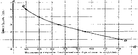 Эту обратную связь между ценой продукта и величиной спроса можно изобразить в виде простого двухмерного графика, показывающего величину спроса на горизонтальной оси, а цену на вертикальной оси. Изображаемый процесс заключается в размещении на графике тех пяти вариантов “цена - количество”, какие показаны в таблице 1. Мы делаем это, проведя перпендикуляры от соответствующих точек на двух осях. Так, например, для нанесения на график варианта: “при цене в 5 дол, величина спроса составляет 10 бушелей” - мы должны провести перпендикуляр от цифры 10 на горизонтальной оси (количество), который должен встретиться с перпендикуляром, проведенным от цифры 5 дол. на вертикальной оси (цена). Если эту операцию проделать для каждого из пяти возможных вариантов, мы в результате получим ряд точек, которые показаны на рисунке 1. Каждая точка представляет конкретную цену и соответствующее количество продукта, которое потребитель решит купить по этой пене. Предположив, что такая же обратная связь между ценой и величиной спроса существует в любой другой точке графика, можно вывести общее заключение об обратной связи между ценой и величиной спроса путем проведения кривой, представляющей все возможные варианты соотношения цены и величины спроса в пределах, показанных на графике. Полученная таким образом кривая называется кривой спроса и обозначена буквами DD на рисунке 1. Она наклоняется вниз и вправо, так как изображаемая ею связь между ценой и величиной спроса отрицательная, или обратная. Закон спроса - люди покупают большее количество продукта при низкой цене, чем при высокой, - находит отражение в нисходящем направлении кривой спроса.