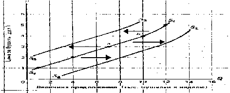 Изменение одной или более детерминант предложения - ресурсных цен, технология производства, цен на другие товары, налогов и дотаций, ожидания изменения цен или числа продавцов на рынке - вызывает изменение в предложении. Увеличение предложения смещает кривую предложения вправо, от S1 к S2. Уменьшение предложения смещает кривую предложения влево, от S1 к S3. Изменение величины предложения вызывает - вследствие изменения цены рассматриваемого продукта - передвижение на неизменной кривой спроса от одной точки к другой, например, от а до b.