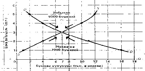 Точка пересечения нисходящей кривой спроса D и восходящей кривой S показывает равновесную цену и количество продукта, в данном случае 3 дол. и 7000 бушелей кукурузы. Нехватка кукурузы, которая возникла бы при цене ниже равновесной, т. е. 2 дол., составила бы 7000 бушелей и толкнула бы цену вверх, в результате чего предложение стало бы увеличиваться, а спрос уменьшаться до тех пор, пока не было бы достигнуто равновесие. Избыток кукурузы при цене 4 дол., т. е. выше равновесной, составил бы, например, 6000 бушелей и стал бы сдвигать цену вниз и тем самым повышать спрос, сокращая предложение до тех пор, пока не будет достигнуто равновесие.