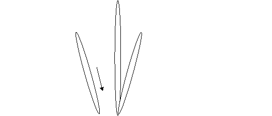 2. Листики. Скатать толстую длинную колбаску, разделить её на три равные части, каждую заострить с обеих сторон, расплющить. Готовые листики разместить между стеблями в нижней части композиции. По внешнему краю каждого листик стекой сделать неглубокие надрезы - зубчики.