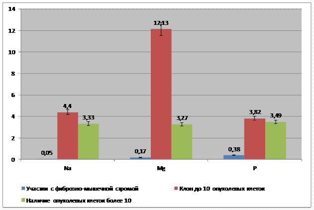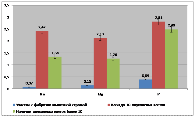 Так, в удаленной ткани предстательной железы без опухолевых клеток содержание кислорода не превышало 25,85± 1,32. В участках с опухолевым клоном без прогрессии опухоли, до 10 клеток, питающегося за счет диффузии питательных веществ из тканевой жидкости и не имеющих сосудов, содержание кислорода доходило до 30, 95± 2,05, при количестве клеток более,16 ±1,52. В случаях прогрессии болезни в участках с клоном клеток до 10 , содержание кислорода составляло 35, 97 ± 2,05, натрия – 4,40 ± 0,05, магния - 12,13 ± 0,03, фосфора - 3,82 ± 0,42. В участках с клоном клеток более 10 - кислорода 44,46 ±1,52, натрия – 3,33± 0,06, магния - 3,27 ± 0,06, фосфора - 3,49±1,21. (рис. 5, 6).