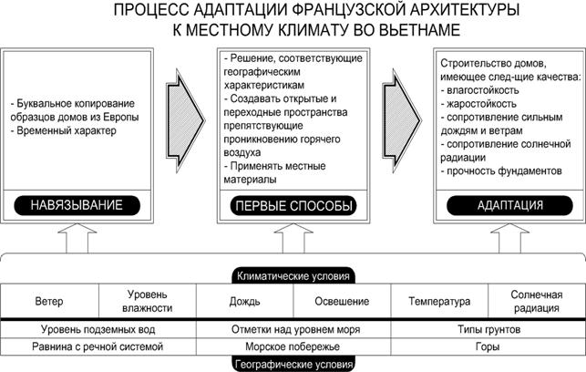 см. Схема 2 – Процесс адаптации Французской архитектуры к местному климату во Вьетнаме (стр. 25).