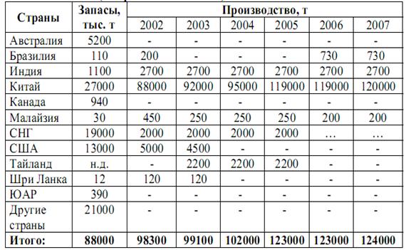 Таблица 1 – Мировые запасы и производство РЗМ в гг.