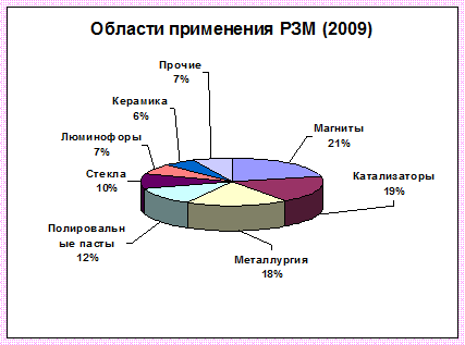 Причем ежегодный рост потребления индивидуальных редких земель значительно опережает (от 25 до 40% в год) рост потребления неразделенных РЗМ (3-5%). Структура мирового потребления РЗМ показана на рисунке 2 (по данным «Rhodia Electronics & Catalysis», «Metall Rare Earth»).