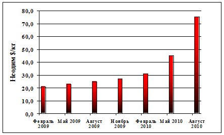 Введение Китаем ограничений на экспорт не удивляет экспертов. По их словам, для КНР типична стратегия захвата рынка за счет демпинга, а затем - подъем цен в разы для постоянных потребителей. На рисунке 4 показана динамика роста цены 1 кг металлического неодима за период с февраля 2009 года по август 2010 года. Обращает на себя внимание удвоение цены за последние полгода.