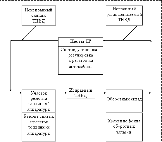 Работы по регулировке ТНВД, и его текущий ремонт будут выполняться: на посту ТР, где будут производить регулировку, замену ТНВД, и участке ремонта топливной аппаратуры, где проведут ремонт топливного насоса (рис. 3.1.). Причем на автомобиль, (в случае невозможности регулировки) будут устанавливать исправный ТНВД из оборотных запасов. Такая схема проведения ТР необходима, чтобы быстрее устранить неисправность (заменить неисправный ТНВД или отрегулировать его) и тем самым уменьшить простой автомобиля в ремонте, быстрее выпустить его на линию. Ремонт снятого ТНВД будет производится в свободное от заявок время с целью пополнения фондов оборотных запасов(для возможных (прогнозируемых) замен ТНВД в будущие периоды времени).