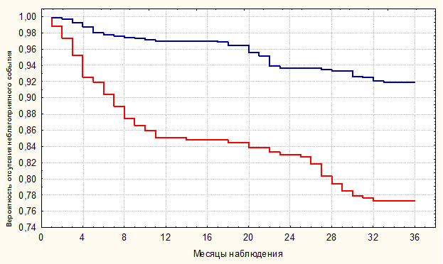 Рисунок 1. Вероятность развития неблагоприятных исходов в группах наблюдения