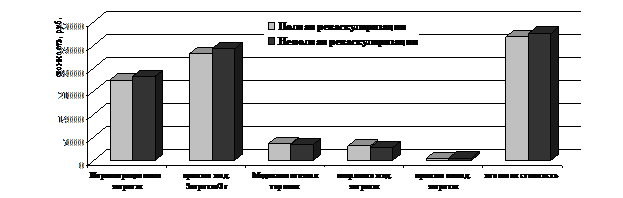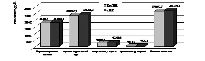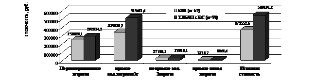 Средняя сумма прямых медицинских затрат в периоперационном периоде у пациентов группы после КШ без ИК составила 252.518±3209,3 руб., в группе после КШ с ИК – 254.162,6±4697,7 руб. (p<0,05).