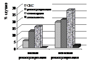 В группе с дискинетичными аневризмами резекция аневризмы ЛЖ в 3 (5%) случае дополнительно выполнена пластика МК. В%) случаях резекция аневризмы была дополнена реваскуляризацией миокарда (в среднем – 2,8±0,2 шунтов).