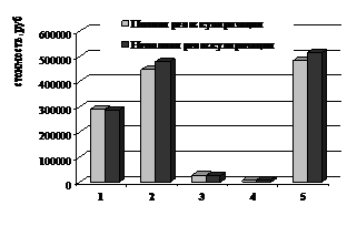 1-периоперационные затраты, руб.; 2 – прямые медицинские затраты за 3 года, руб.; 3 – непрямые медицинские затраты за 3 года, руб.; 4 – прямые немедицинские затраты за 3 года; 5 – итоговые затраты за 3 года, руб.