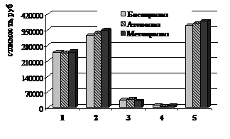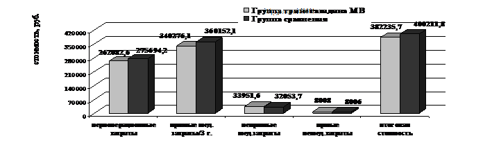 1 – периоперационные затраты, руб., 2 – прямые медицинские затраты за 3 года, руб., 3 – непрямые медицинские затраты за 3 года, руб., 4 – прямые немедицинские затраты за 3 года, руб.; 5 – итоговая стоимость, руб.