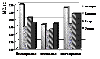 Выявлена тенденция к снижению МС (в группе периндоприла с 213,1±4,4 ед., до 203,5±6,7 ед. к концу наблюдения). В группе эналаприла и лизиноприла - недостоверное снижение МС, (с 208,8±5,5 ед. до 207,7±4,5 ед. и с 208,4±5,6 ед. до 202,1±9,9 ед. соответственно).