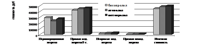 Затраты на медикаментозную терапию бисопрололом составили 8.138,4±425,8 руб., атенололом - 2.628±101,5 руб., метопрололом – 6.709,2±447,1 руб.