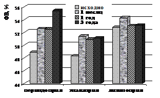 Отмечено, что ФВ ЛЖ в группе периндоприла увеличилась за период наблюдения на 11,7% (с 48,9%±1,2 до 55,4%±2), в группе эналаприла - на 6,7% (с 48,3%±1,2 до 51,1%±0,9), в группе лизиноприла – на 0,6% (с 52,8%±1 до 53,1%±0,9) (рис. 16).