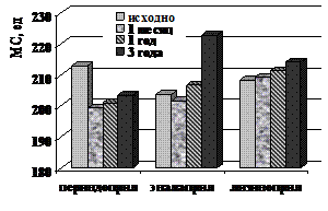 Была обнаружена тенденция к уменьшению МС. В группе триметазидина МВ, исходно величина МС составила 207,6±4,4 ед., к концу периода наблюдения 205,5±2,5 ед. В группе сравнения отмечался рост величины МС к концу периода наблюдения.
