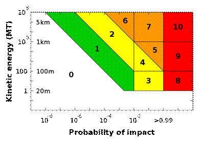 По горизонтали — вероятность соударения, по вертикали — кинетическая энергия соударения в мегатоннах. Если объект имеет не 0 по Туринской шкале, то это очень и очень плохо. Даже опасность, равная единице, означает вероятность соударения и практически полную уверенность в том, что объект не сгорит в атмосфере.