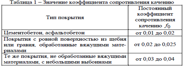 где V – расчетная скорость движения автомобиля, км/ч; f0 – постоянный коэффициент сопротивления качению колес автомобиля в зависимости от поверхности дороги (таблица 1).